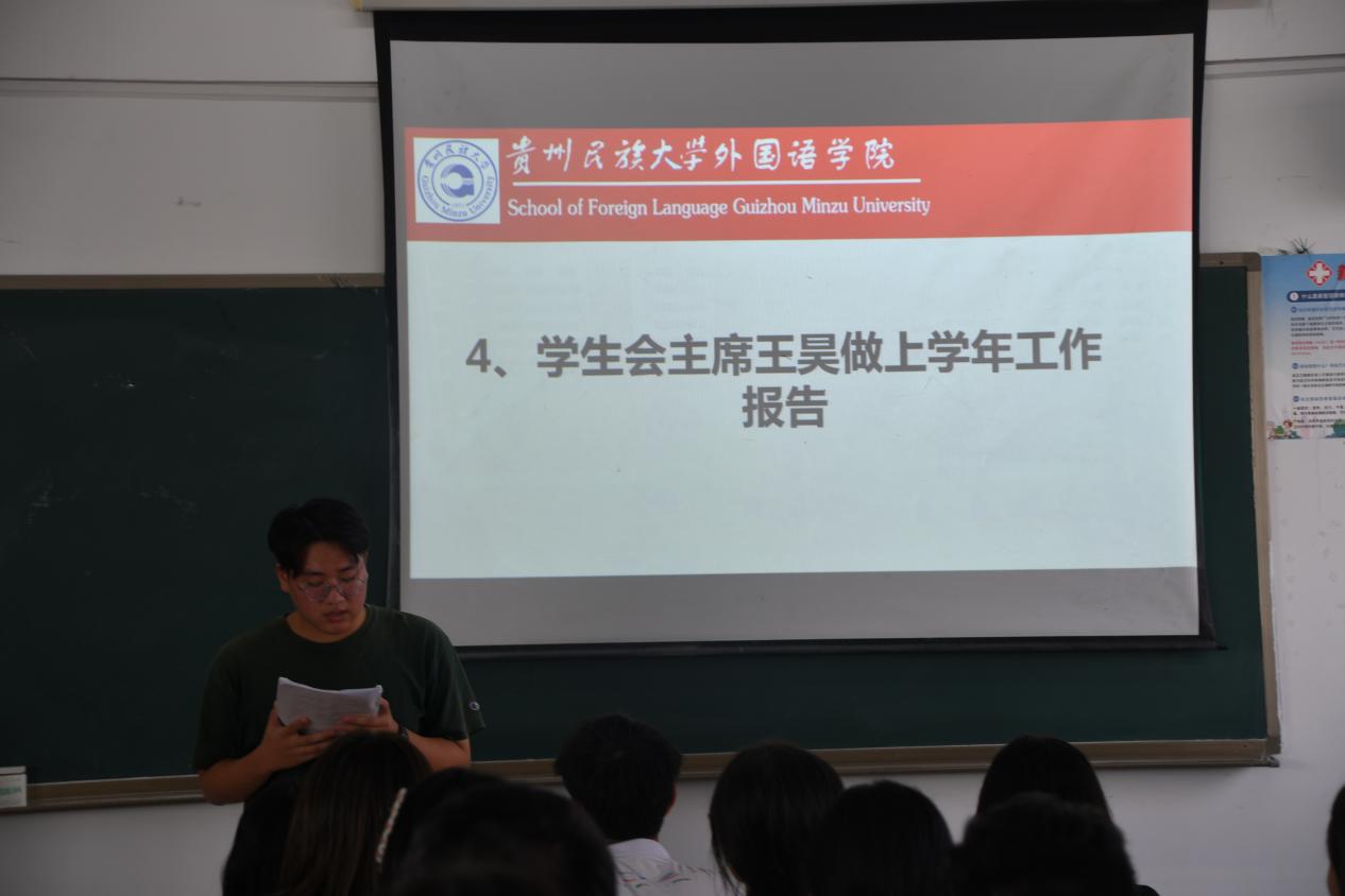 辛雅婷宣读召开第二次学生代表大会请示的批复后,上学年学生会主席王昊作工作汇报。王昊从“固本强基,夯实组织基础”、“关注社会热点,深化理论学习,引导学生树立正确的世界观、人生观、价值观”、“立足学院特色,树立学院品牌,开展带有外院特色主题活动”、“保持优点,不断以实际行动改进不足”四个方面对上一学年的工作作总结报告,并祝福我院团委学生会不断发展,不断进步。