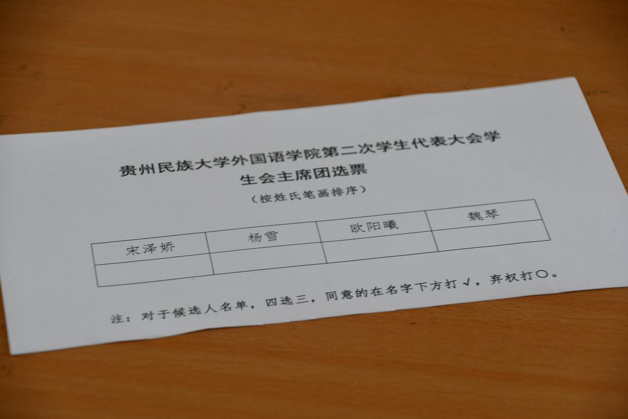 辛雅婷宣读学生会主席团成员候选人选举办法后学生干部投票选举,经总监票人、监票人、总计票人、计票人的整合统计后,确定主席团名单为:杨雪,宋泽娇,欧阳曦。