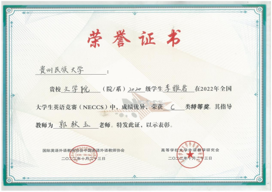 郭秋玉老师指导的文学院2022级李雅君同学脱颖而出,一举夺得C类特等奖。