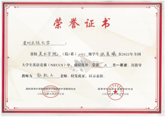 郭秋玉老师指导的美术学院2021级张晨曦同学获A类一等奖。