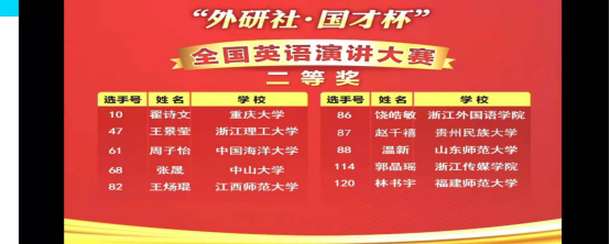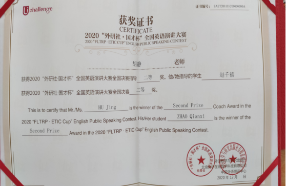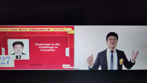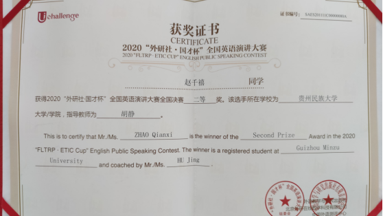 在我校球友会领导的大力支持下,由球友会胡静老师指导的文学院2017级戏剧影视文学专业的赵千禧同学在第一阶段演讲中以“Challenge to All, Challenge to Humanity”为题,稳定发挥,以小组赛第二的成绩(89.75分)突围进入15日第二阶段(线上)比赛,成为本次演讲大赛贵州省唯一进入88强的选手,最终荣获全国英语演讲大赛二等奖,再创历史最好成绩!