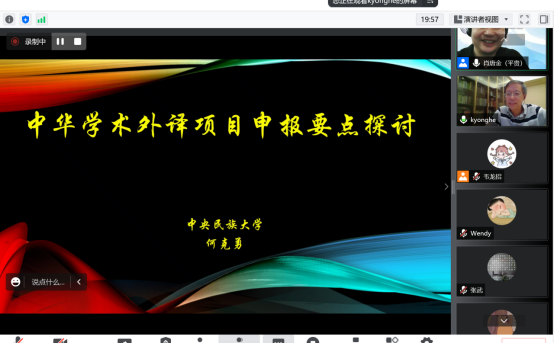 2022年6月18日晚,中央民族大学何克勇教授应邀做客球友会“新知讲坛”,通过腾讯会议线上平台进行了题为“中华学术外译项目申报要点探讨”的报告。本次讲座由球友会院长肖唐金教授主持,来自校内外的数十名师生参加了本次讲座。