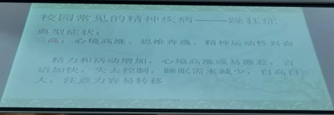 接着贵州省第二人民医院心理咨询与治疗中心的赵雪治疗师从正常心理与异常心理的区别、心理健康的含义、心理健康水平的标准以及一些常见精神疾病的症状和特点以及持续时间等多方面介绍了校园常见精神疾病的识别与判断。增加了与会人员对精神疾病的认识,判断以及对自身状况的一个清晰界定。赵雪治疗师强调现在没有点什么疾病不算正常人。以幽默风趣易于接受的语言鼓励大家用一颗充满爱的心去观察,持包容理解的心态去看待生活中遇到精神疾病困难的同学,并勇于伸出援助之手。