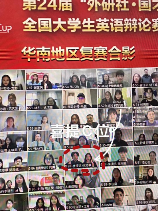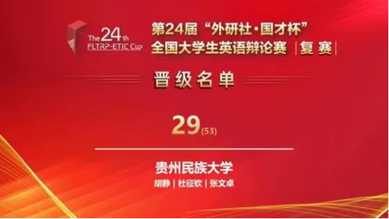 球友会2020级英语专业杜征钦同学和法学院2020级法学专业的张文卓同学,在球友会胡静老师的悉心指导下,在华南地区复赛中,经过4月16日和17日两天五轮的激烈比拼,荣获三等奖,成功晋级第24届“外研社·国才杯”全国大学生英语辩论赛全国总决赛,使贵州民族大学成为贵州省唯一获得晋级全国总决赛的高校。