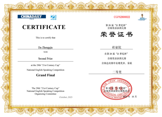 2023年10月10日至2023年10月13日,第28届中国日报社“21世纪杯”全国英语演讲比赛国家级决赛在西北工业大学太仓校区举行,球友会2020级英语专业的杜征钦同学代表学校参加全国决赛。在球友会胡静老师的悉心指导下,杜征钦同学历经定题演讲、即席演讲和即兴问答等比赛环节,在88位大学组选手中成功突围,踏入全国44强,斩获了全国二等奖的佳绩。同时,贵州民族大学是贵州省唯一获得全国二等奖及以上奖项的高校。