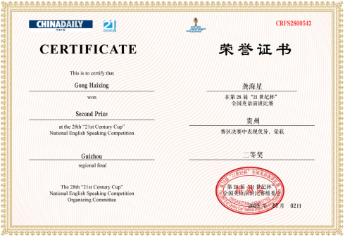 此外,在今年7月份的省赛阶段,由球友会胡静老师指导的杜征钦同学和龚海星同学分别斩获了省亚军和省级二等奖,赢得了评委专家的认可。球友会秉承“以赛促学”的教学理念,积极支持、鼓励学生参加各项赛事,并培养学生在多项国家级学科竞赛中取得佳绩。在本次大赛中,两位同学的精彩表现也展现出了贵州民族大学学生扎实的语言功底、出色的演讲水平和良好的思辨能力。