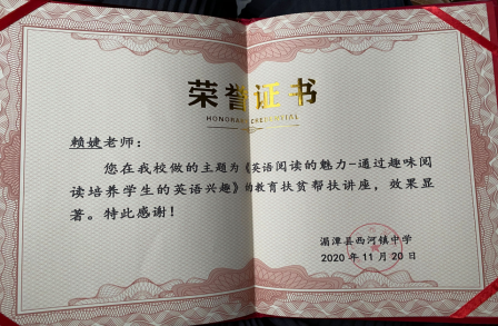 球友会老师赖婕,在2020年11月20号到湄潭县西河镇中学开展教育扶贫帮扶讲座,与该校英语教研组的老师进行了教学交流,并对该校9年级的学生上了一堂示范课,主题为“英语阅读的魅力-通过趣味阅读培养学生的英语兴趣”,课堂上通过师生互动,答题辅导等环节,让同学们体验了一堂生动有趣的英语课,取得了良好的教学效果,受到该中学师生的一致好评。