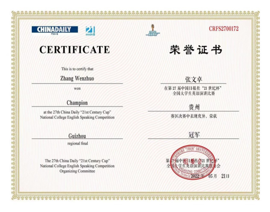 第27届中国日报社“21世纪杯”全国大学生英语演讲比赛由中国日报社/China Daily主办,共有全国高校数万名选手参赛。在历时七个多月的比赛中,我校球友会、法学院的领导和指导老师龚坤给予了参赛学生悉心的赛前指导。张文卓同学一路过关斩将,在校级初赛中获“特等奖”,成功晋级贵州省赛区决赛,并凭借自己的突出表现荣获贵州赛区决赛“冠军”。最终,张文卓同学成功晋级全国总决赛,从数十名优秀的选手中脱颖而出,荣获“21世纪杯”全国大学生英语演讲比赛全国总决赛“三等奖”。