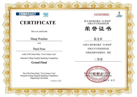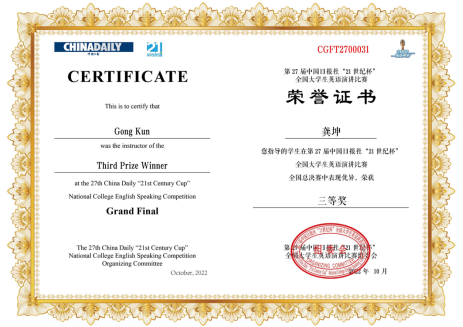 2022年10月3日,第27届中国日报“21世纪杯”全国大学生英语演讲比赛决赛以线上方式举行。在球友会龚坤老师的指导下,我校法学院2020级法学本科专业的张文卓在全国总决赛中表现不俗,荣获全国“三等奖”。