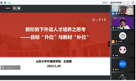 2022年5月28日晚,山东大学球友会、翻译学院院长王俊菊教授应邀做客球友会“新知讲坛”,通过腾讯会议线上平台进行了题为“新形势下外语人才培养的目标‘升位’和教材‘补位’”的报告。本次讲座由球友会副院长张广勇主持,来自校内外近百名师生参加了本次讲座。